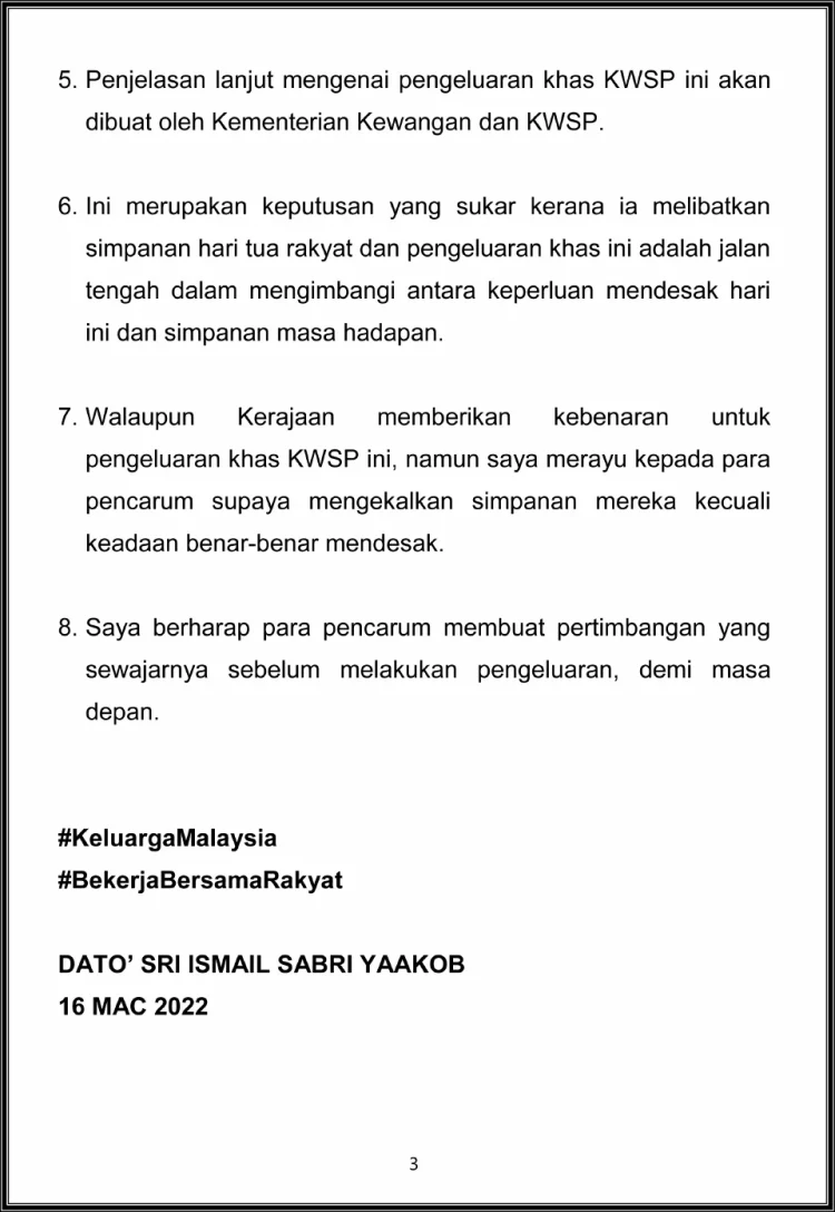 Kerajaan mendengar, mengkaji dan meneliti permintaan daripada semua pihak untuk mengeluarkan caruman KWSP. Justeru, hari kini 16 Mac 2022 kerajaan bersetuju membenarkan pengeluaran khas KWSP itu.