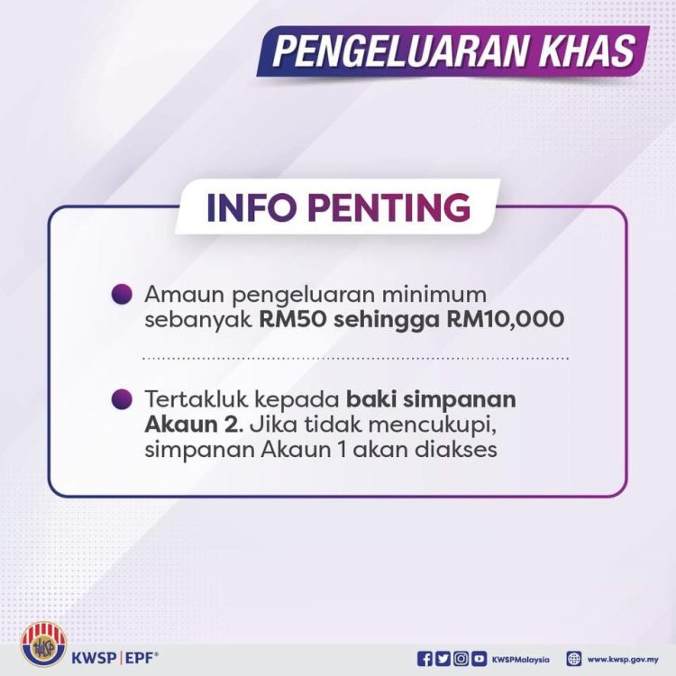 Walaubagaimanapun pengeluaran khas KWSP sehingga RM10,000 adalah tertakluk kepada baki simpanan Akaun 2. Tidak tidak mencukupi, simpanan Akaun 1 akan diakses.