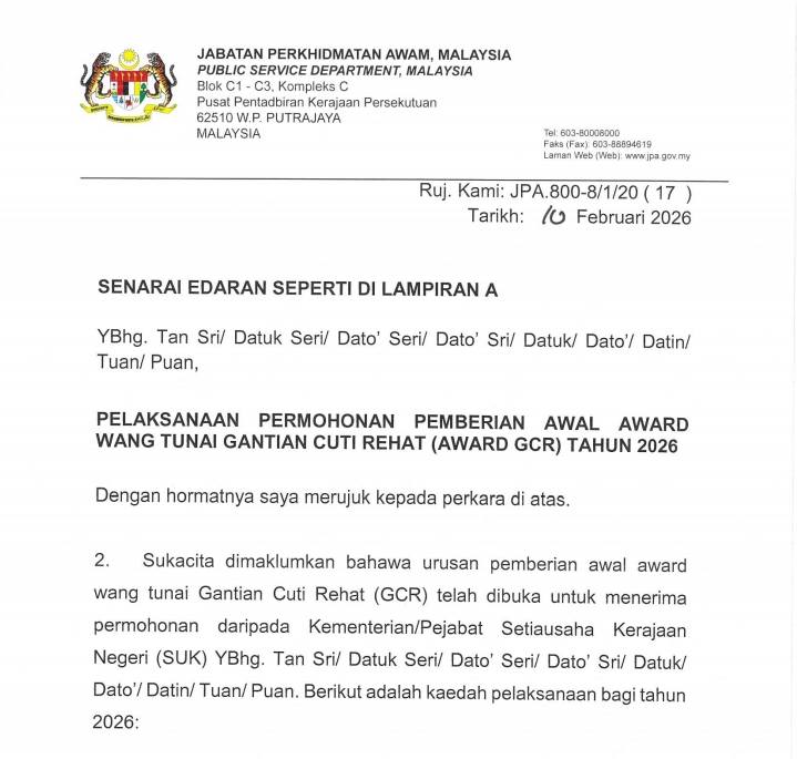 Perkara ini dimaklumkan melalui surat rasmi Jabatan Perkhidmatan Awam (JPA) bertarikh 10 Februari 2026 berkaitan Pelaksanaan Permohonan Pemberian Awal Award Wang Tunai Gantian Cuti Rehat (Award GCR) Tahun 2026.