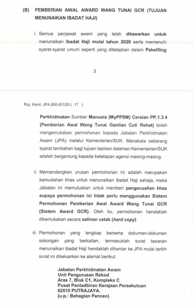 Penjawat awam yang bakal menunaikan ibadat haji pada tahun 2026 kini boleh menarik nafas lega apabila kerajaan membenarkan permohonan pemberian awal Award Wang Tunai Gantian Cuti Rehat (GCR) sehingga RM10,000 bagi membantu kos menunaikan ibadat haji.