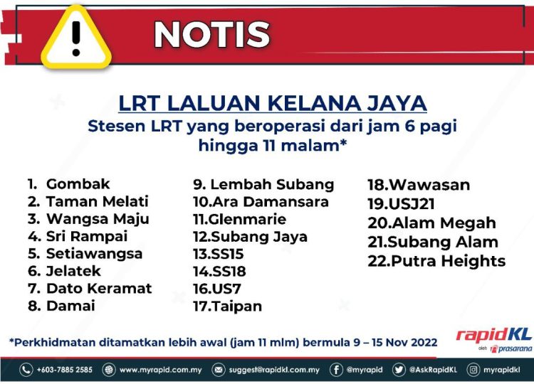 Berikut adalah 16 stesen LRT yang TIDAK BEROPERASI bermula 9 November hingga 15 November 2022: