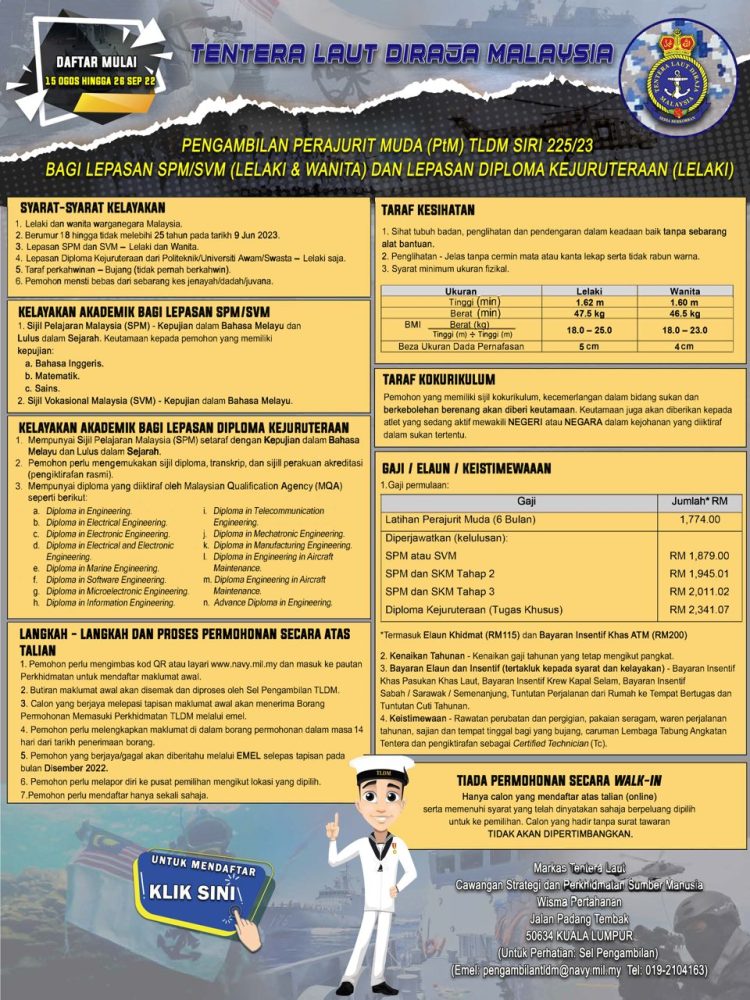 Tentera Laut Diraja Malaysia (TLDM) mempelawa belia tanah air wanita dan lelaki yang berkelayakan serta berminat untuk berkhidmat sebagai anggota lain-lain pangkat (IPT) bagi mengisi permohonan pengambilan Perajurit Muda TLDM Siri 225/23.