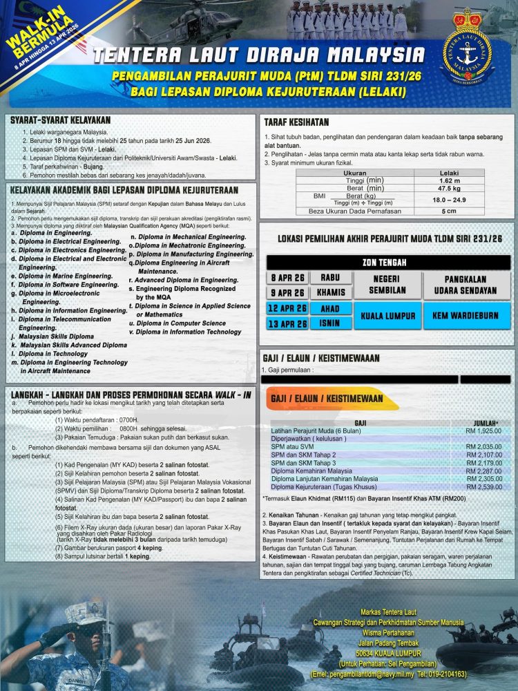 Pengambilan Perajurit Muda Tentera Laut Diraja Malaysia (TLDM) Siri 231/26 kini dibuka kepada calon lelaki lepasan diploma kejuruteraan yang berminat membina kerjaya dalam sektor pertahanan negara. Peluang ini dilaksanakan secara walk-in, menjadikannya antara peluang terpantas untuk memasuki perkhidmatan awam tanpa melalui proses permohonan panjang.
