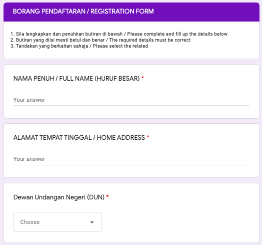 Lengkapkan borang pendaftaran yang disediakan. Butiran yang diisi mestilah betul dan benar.