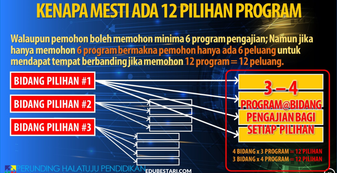 Tetapi jika pelajar merancang betul-betul 12 pilihan yang ingin dipohon, jika ditawarkan ke pilihan yang ke 11 atau 12 sekalipun pelajar pasti tidak rasa kecewa kerana ianya juga adalah antara program pilihan pelajar sendiri.