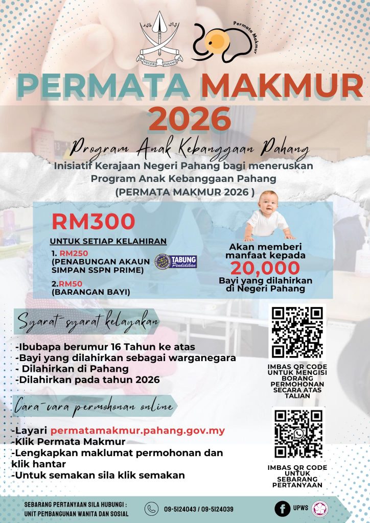Kerajaan Negeri Pahang terus komited dalam menjaga kebajikan rakyat melalui pelbagai inisiatif yang memberi manfaat secara langsung kepada masyarakat. Salah satu program yang diteruskan pada tahun 2026 ialah Program Permata Makmur, yang memfokuskan kepada bantuan awal kelahiran bayi.