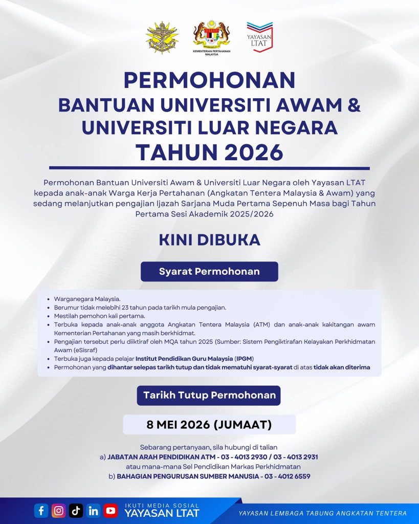 Permohonan Bantuan Universiti Awam & Universiti Luar Negara Yayasan LTAT 2026 kini dibuka kepada anak-anak warga Angkatan Tentera Malaysia (ATM) dan kakitangan awam Kementerian Pertahanan yang melanjutkan pengajian Ijazah Sarjana Muda Tahun Pertama.