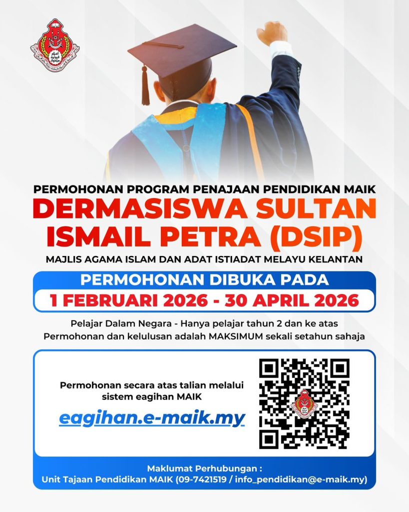 Majlis Agama Islam dan Adat Istiadat Melayu Kelantan (MAIK) membuka permohonan Program Penajaan Pendidikan MAIK: Dermasiswa Sultan Ismail Petra (DSIP) bagi tahun 2026. Bantuan ini khas untuk pelajar dalam negara yang sedang melanjutkan pengajian dan memenuhi syarat yang ditetapkan.