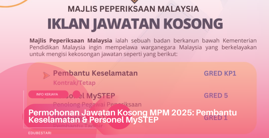 Majlis Peperiksaan Malaysia (MPM) membuka peluang kerjaya kepada warganegara Malaysia yang berkelayakan untuk mengisi beberapa jawatan penting bagi tahun 2025. Sebagai badan berkanun di bawah Kementerian Pendidikan Malaysia, MPM memainkan peranan besar dalam pengurusan peperiksaan kebangsaan, termasuk STPM dan MUET. Peluang ini amat sesuai bagi individu yang ingin menyumbang kepada sistem pendidikan negara.