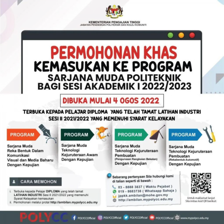 Panggilan buat pelajar yang sedang mengikuti pengajian peringkat diploma di Politeknik dan telah tamat latihan industri sesi II 2021/2022! Permohonan khas bagi kemasukan ke Program Sarjana Muda Politeknik bagi sesi akademik I 2022/2023 kini telah dibuka buat pelajar yang berminat nak sambung pengajian ke peringkat lebih tinggi.