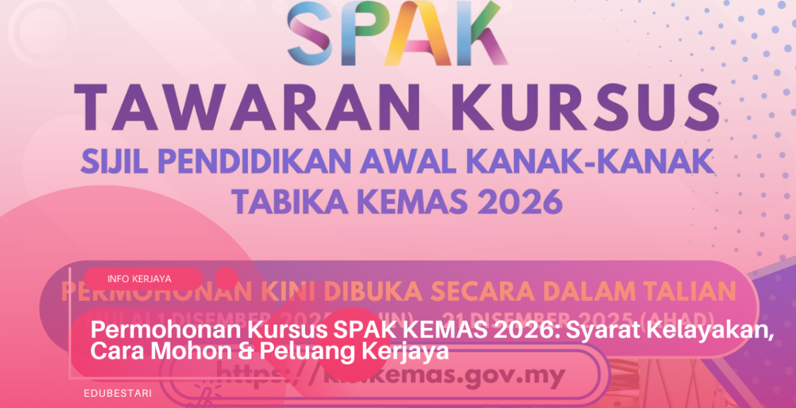 Kursus Sijil Pendidikan Awal Kanak-kanak (SPAK) KEMAS merupakan salah satu laluan terbaik bagi individu yang berminat membina kerjaya dalam bidang pendidikan awal kanak-kanak. Untuk tahun 2026, KEMAS sekali lagi membuka tawaran kepada calon warganegara Malaysia yang berkelayakan untuk menyertai kursus ini. Peluang ini amat sesuai untuk lepasan diploma yang ingin meluaskan potensi kerjaya dalam sektor pembangunan masyarakat.