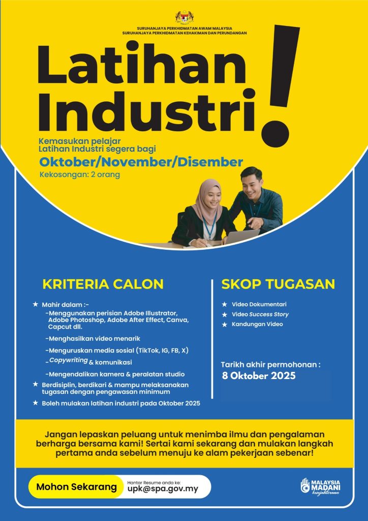 Tarikh akhir permohonan adalah pada 8 Oktober 2025, dan calon yang berminat perlu menghantar resume ke alamat e-mel rasmi: upk@spa.gov.my.