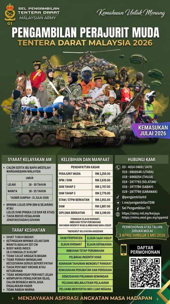 Tentera Darat Malaysia (TDM) kini membuka peluang kepada rakyat Malaysia yang berminat untuk menyertai perkhidmatan ketenteraan melalui Pengambilan Perajurit Muda 2026. Pengambilan ini memberi peluang kepada lepasan SPM, TVET dan Diploma untuk membina kerjaya dalam sektor pertahanan negara yang stabil dan berprestij.