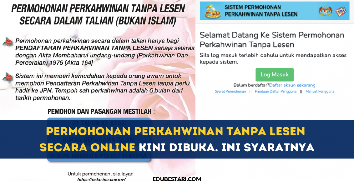 Jabatan Pendaftaran Negara (JPN) kini menawarkan kemudahan permohonan perkahwinan tanpa lesen secara dalam talian buat pasangan bukan Islam. Permohonan hanya dibuka kepada pasangan warganegara Malaysia yang beralamat di dalam MyKad seperti yang dinyatakan di dalam syarat-syarat am permohonan sahaja.