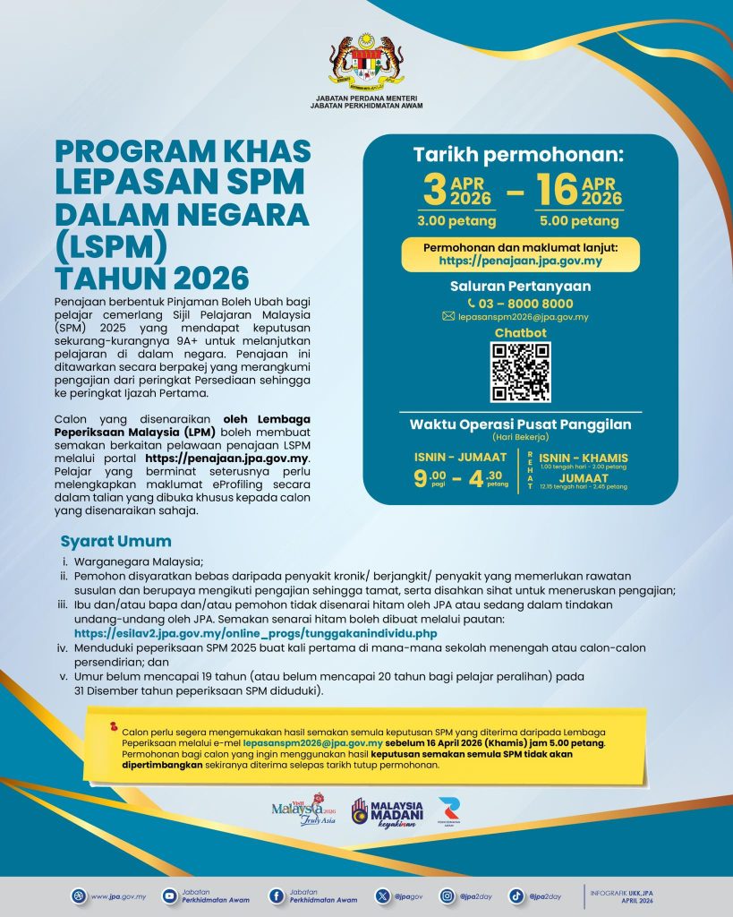 Program Khas Lepasan SPM Dalam Negara (LSPM) Tahun 2026 kini dibuka kepada pelajar lepasan SPM 2025 yang memperoleh keputusan cemerlang. Inisiatif oleh Jabatan Perkhidmatan Awam (JPA) ini bertujuan memberi peluang kepada pelajar terbaik negara untuk melanjutkan pengajian di institusi pengajian tinggi dalam negara dengan sokongan penajaan penuh.