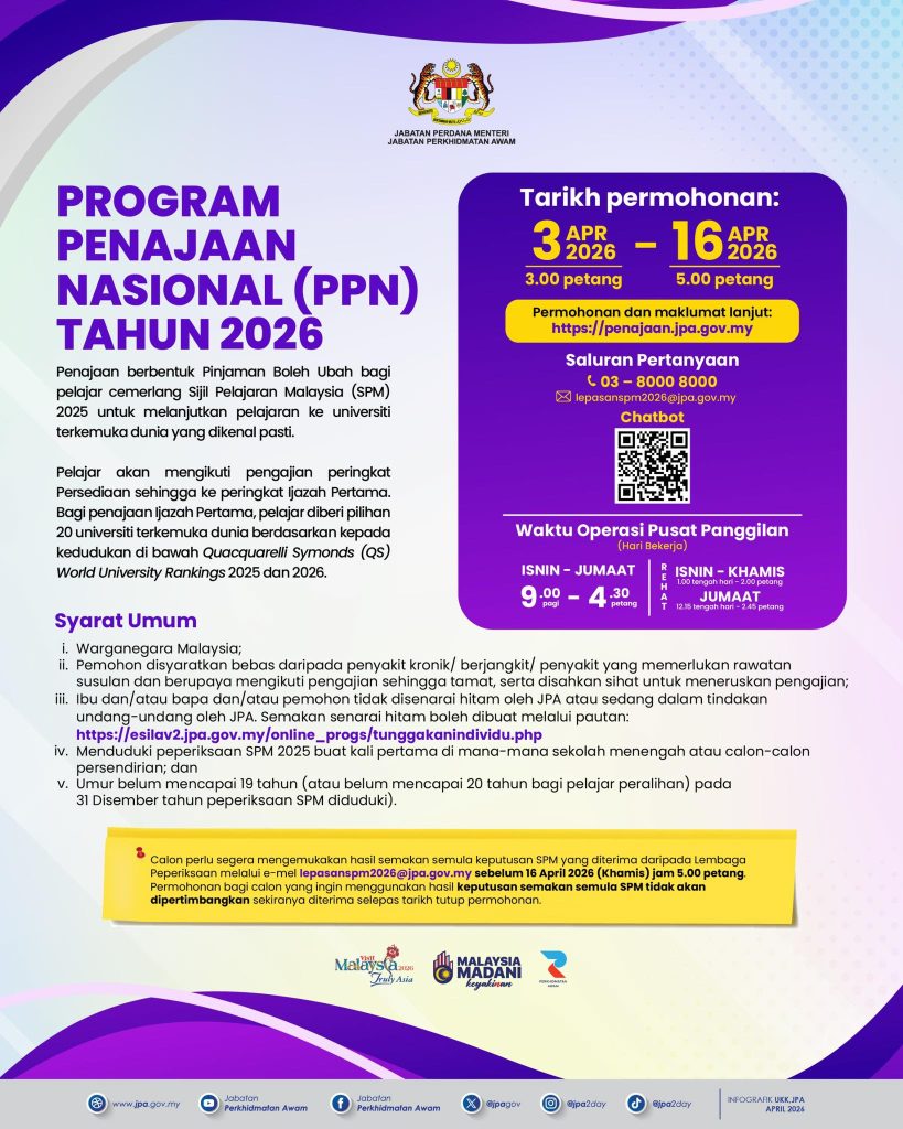 Program Penajaan Nasional (PPN) Tahun 2026 kini dibuka kepada lepasan SPM 2025 yang cemerlang dan bercita-cita tinggi untuk melanjutkan pengajian ke peringkat antarabangsa. Inisiatif ini merupakan salah satu usaha kerajaan melalui Jabatan Perkhidmatan Awam (JPA) dalam melahirkan modal insan berkualiti tinggi yang mampu bersaing di peringkat global.
