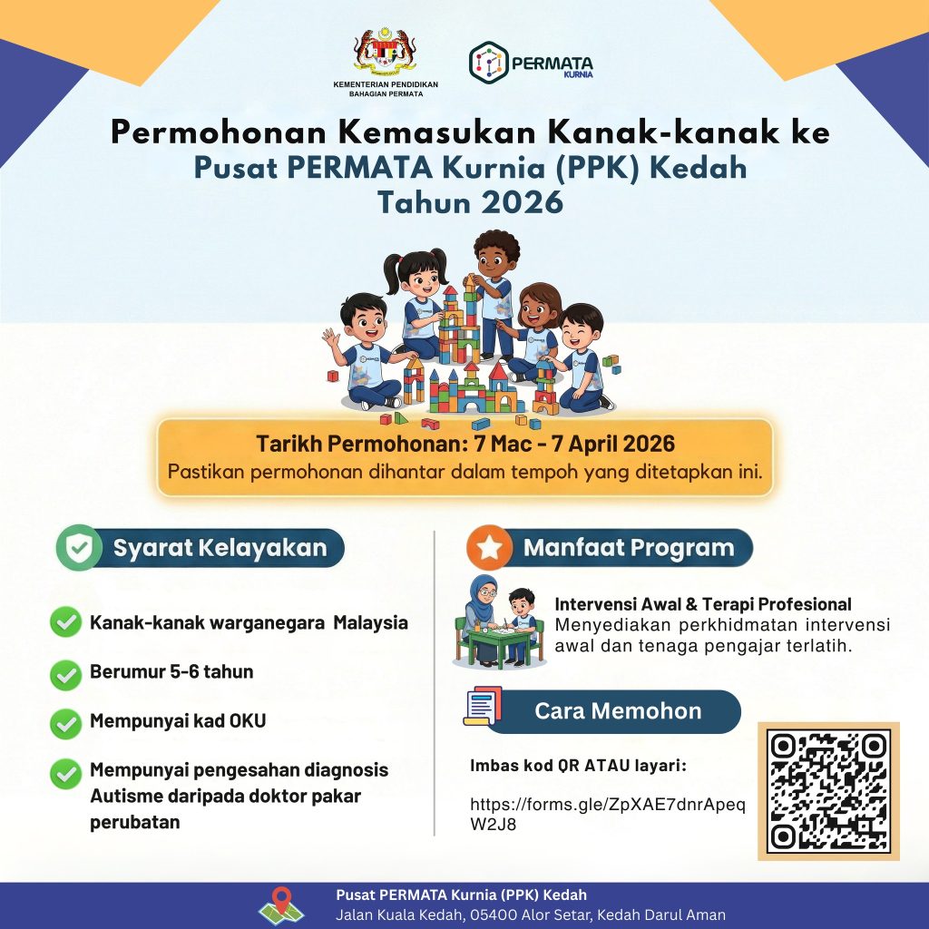 Permohonan kemasukan ke Pusat PERMATA Kurnia (PPK) Kedah Tahun 2026 kini dibuka kepada ibu bapa atau penjaga yang mempunyai anak berkeperluan khas khususnya dalam spektrum Autisme. Program ini merupakan salah satu inisiatif kerajaan melalui Kementerian Pendidikan Malaysia (KPM) bagi menyediakan perkhidmatan intervensi awal yang berkualiti kepada kanak-kanak.