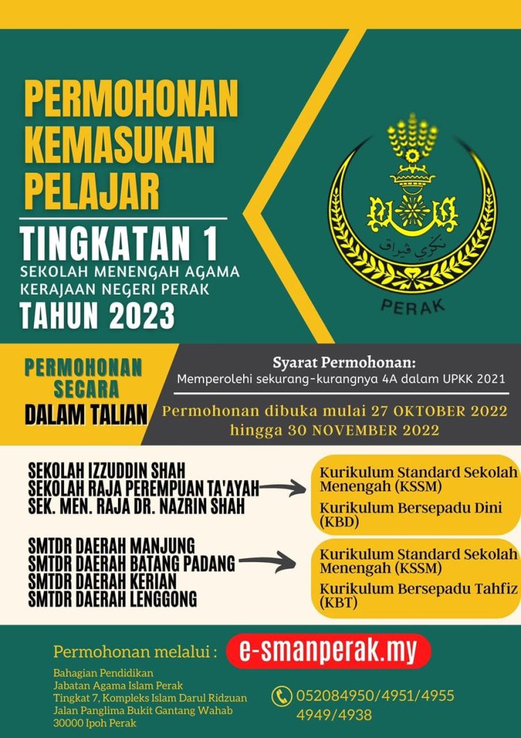Permohonan kemasukan pelajar tingkatan 1 Sekolah Menengah Agama Kerajaan Negeri Perak bagi tahun 2023 dibuka sepanjang tempoh berikut: