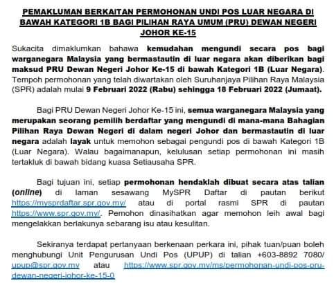 Bagi urusan permohonan undi pos luar negara dan dalam negara, permohonan undi pos untuk pengundi kategori Borang 1B dan kategori 1C dibuka sehingga 18 Februari 2022.