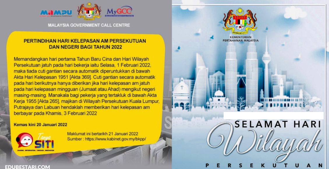 Tarikh Hari Wilayah Persekutuan jatuh pada 1 Februari 2022 (Selasa) bersamaan dengan hari pertama Tahun Baru Cina tahun 2022. Ada ke cuti gantian bagi pertindihan cuti penting ini?