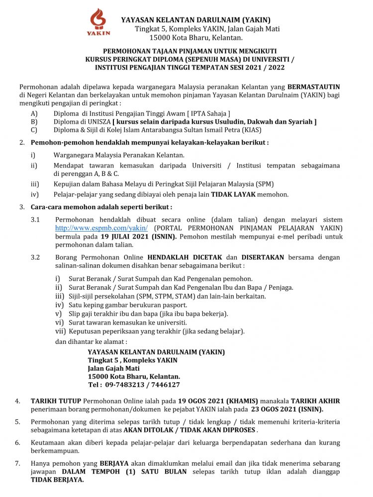 Permohonan pinjaman pengajian adalah dipelawa kepada warganegara Malaysia peranakan Kelantan yang bermaustatin di Negeri Kelantan dan berkelayakan untuk memohon pinjaman tajaan Yayasan Kelantan Darulnaim (YAKIN) bagi mengikuti kursus peringkat Diploma di Institusi Pengajian Tinggi (IPT) tempatan sesi 2021/2022.