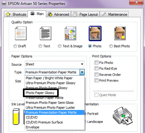 Tidak kisah jenama apa yang anda gunakan, asalkan ada setting untuk glossy paper.