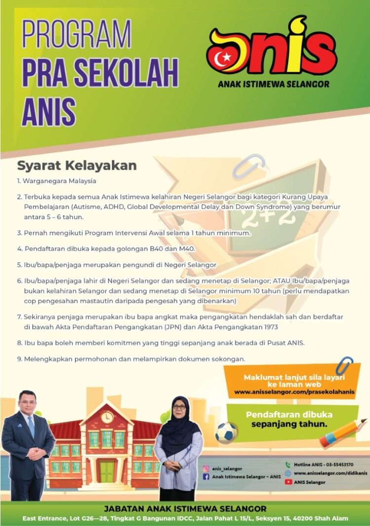 Pendaftaran Program Intervensi & Pra Sekolah ANIS Untuk Anak Kurang Upaya Pembelajaran