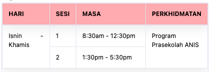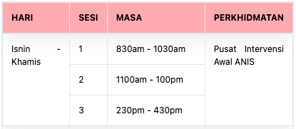 Pusat Sokongan Pendidikan Awal ANIS akan beroperasi seperti berikut: