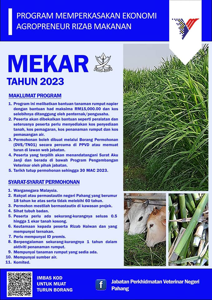 Satu Program Memperkasakan Ekonomi Agropreneur Rizab Makanan dibawah Jabatan Perkhidmatan Veterinar Negeri Pahang telah dibuka untuk permohonan. Program ini melibatkan bantuan tanaman rumput napier dengan bantuan had maksima RM15,000.00.