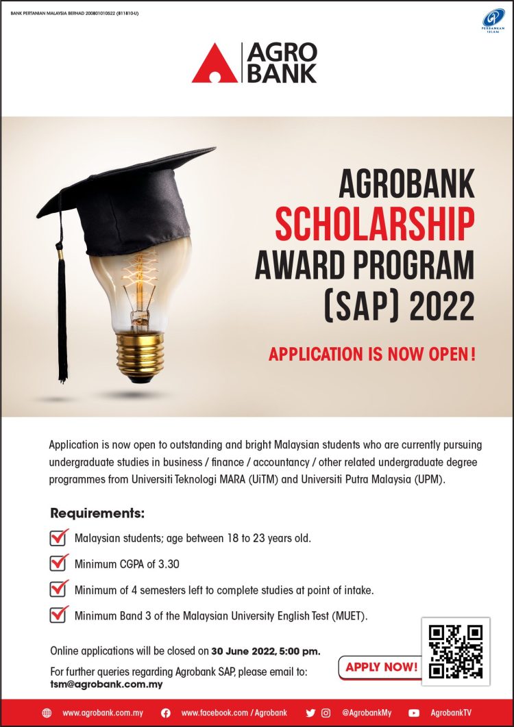Pelajar Malaysia yang berumur 18 tahun hingga 23 tahun yang sedang mengikuti pengajian Ijazah Sarjana Muda sepenuh masa di Institut Pengajian Tinggi (IPT) Tempatan dipelawa untuk mohon bantuan kewangan melalui Program Biasiswa Agrobank (SAP) yang ditawarkan. Pelajar yang menerima Pinjaman PTPTN juga dibenarkan untuk mohon!