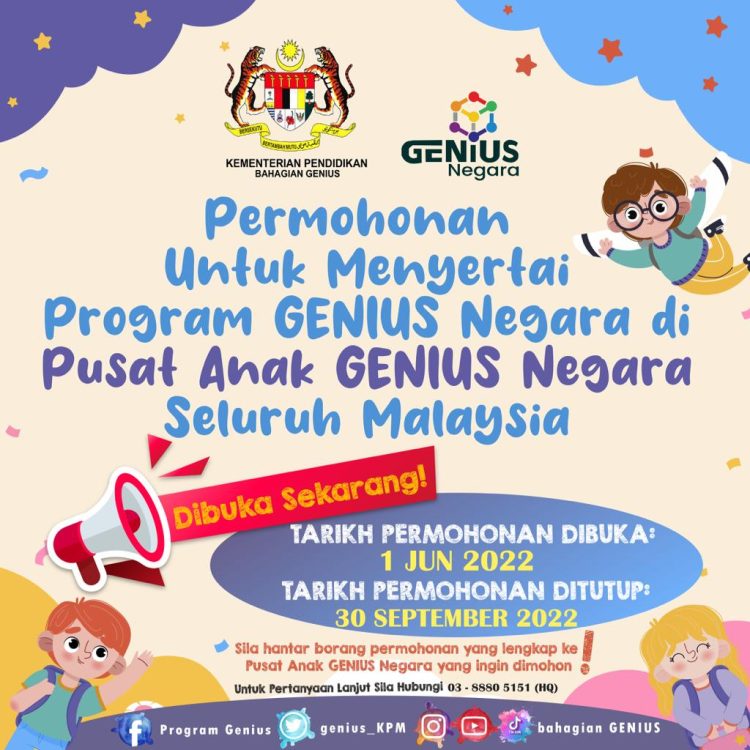 Ibu bapa yang berminat untuk mendaftarkan anak-anak yang berumur 4 tahun ke bawah untuk menyertai Program GENIUS Negara ini boleh membuat permohonan sekarang sebelum tarikh tutup permohonan iaitu 30 September 2022.