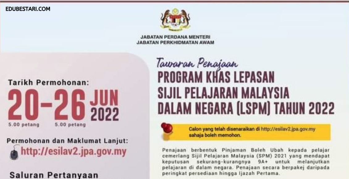 Jabatan Perkhidmatan Awam (JPA) mempelawa lepasan SPM mohon tajaan Program Khas Lepasan Sijil Lepasan Malaysia Dalam Negara (LPSM). Program ini merupakan penajaan berbentuk Pinjaman Boleh Ubah kepada pelajar cemerlang Sijil Pelajaran Malaysia (SPM) yang mendapat keputusan sekurang-kurangnya 9A+ untuk melanjutkan pelajaran dalam negara.