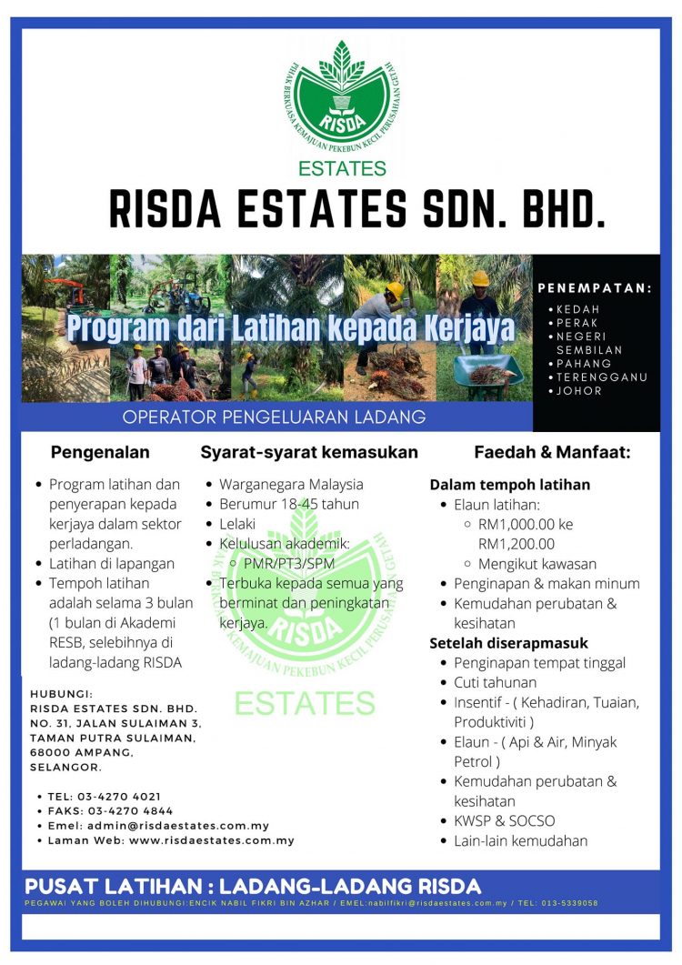 RISDA ESTATES SDN. BHD menawarkan program latihan dan kerjaya kepada lepasan sekolah yang berminat untuk menyertai Program latihan dan penyerapan kepada kerjaya dalam sektor perladangan.