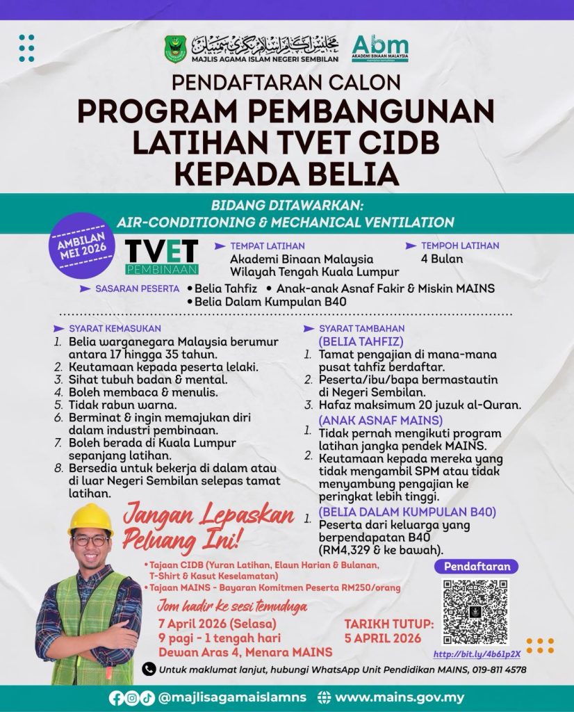 Golongan belia yang berminat membina kerjaya dalam bidang kemahiran kini mempunyai satu peluang yang sangat baik melalui Program Pembangunan Latihan TVET CIDB kepada Belia yang dianjurkan oleh Majlis Agama Islam Negeri Sembilan (MAINS) dengan kerjasama Akademi Binaan Malaysia (ABM).