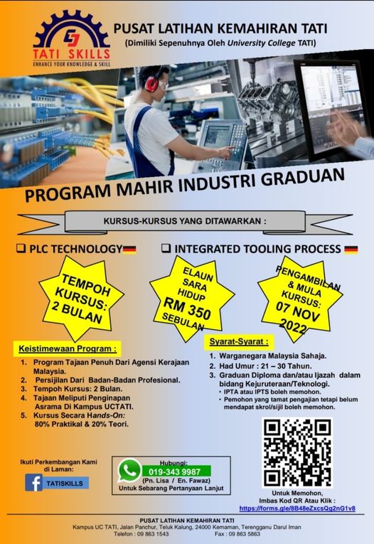 Berminat nak belajar kemahiran baharu?TATI SKILLS dengan tajaan penuh kerajaan Malaysia ingin mempelawa lepasan graduan berumur 21 hingga 30 tahun yang berminat ikuti kursus latihan di Pusat Latihan Kemahiran TATI yang kini dibuka bagi pengambilan November 2022.