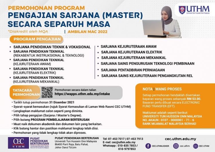 Tawaran Pengajian Sarjana Pendidikan & Kejuruteraan Separuh Masa UTHM Ambilan Mac 2022