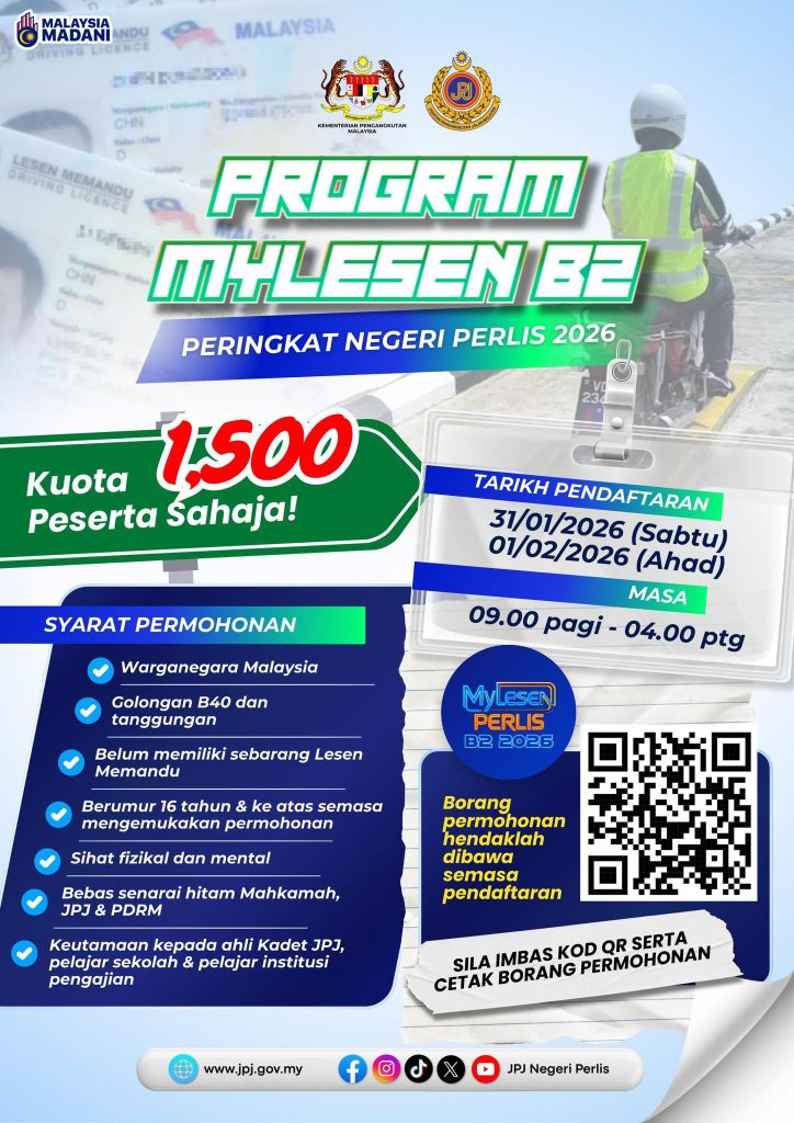 Program MyLESEN B2 Negeri Perlis 2026 merupakan peluang yang baik khususnya kepada golongan B40 dan belia yang belum memiliki lesen memandu motosikal.