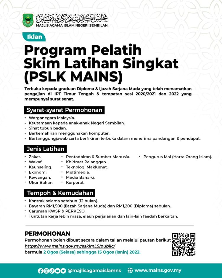 Graduan Diploma dan Ijazah Sarjana Muda yang telah menamatkan pengajian di IPT Timur Tengah dan IPT tempatan sesi 2020/2021 dan 2022 yang telah menerima surat senat adalah dipelawa untuk menyertai Program Pelatih Skim Latihan Singkat (PSLK MAINS 3.0) bagi meningkatkan kemahiran dan kebolehpasaran kerja.