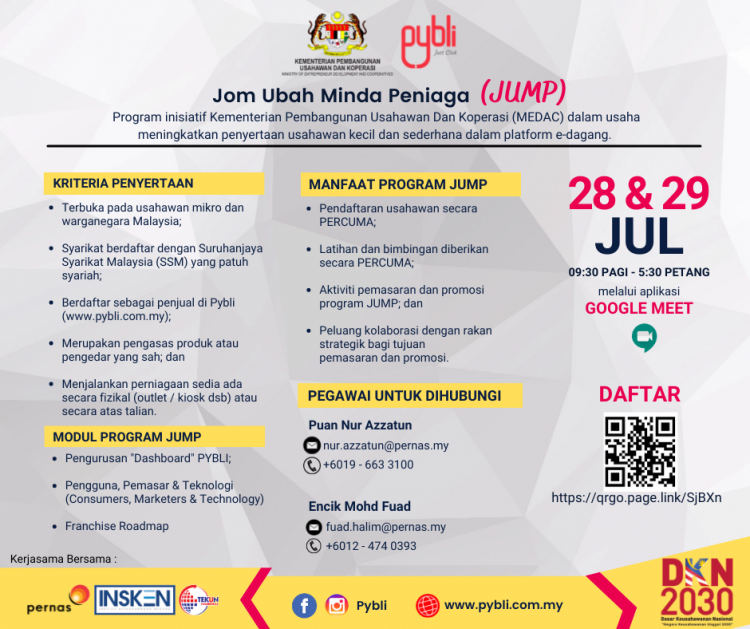 Usahawan yang berminat boleh buat pendaftaran sekarang untuk sertai program JUMP yang akan dilaksanakan secara online melalui Google Meet. Program latihan paling awal akan berlangsung tarikh yang ditetapkan.