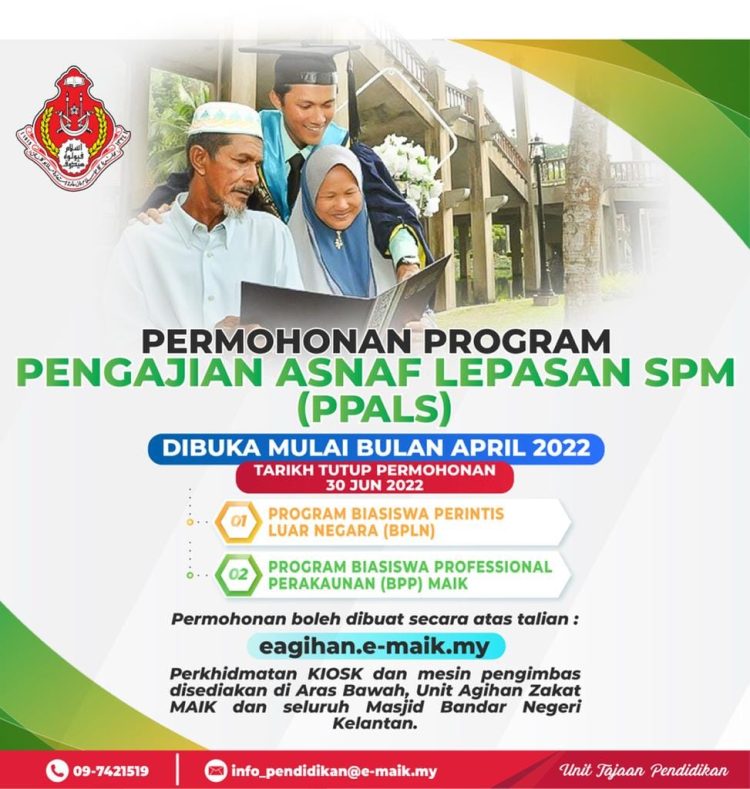 Permohonan untuk Program Pengajian Asnaf Lepasan SPM (PPALS) Majlis Agama Islam dan Adat Istiadat Melayu Kelantan (MAIK)di bawah Kod Program 21121 masih dibuka. Permohonan ini melibatkan 2 program pengajian ditawarkan.