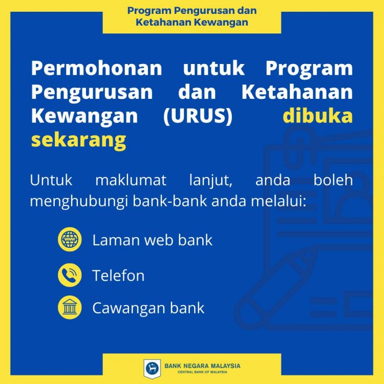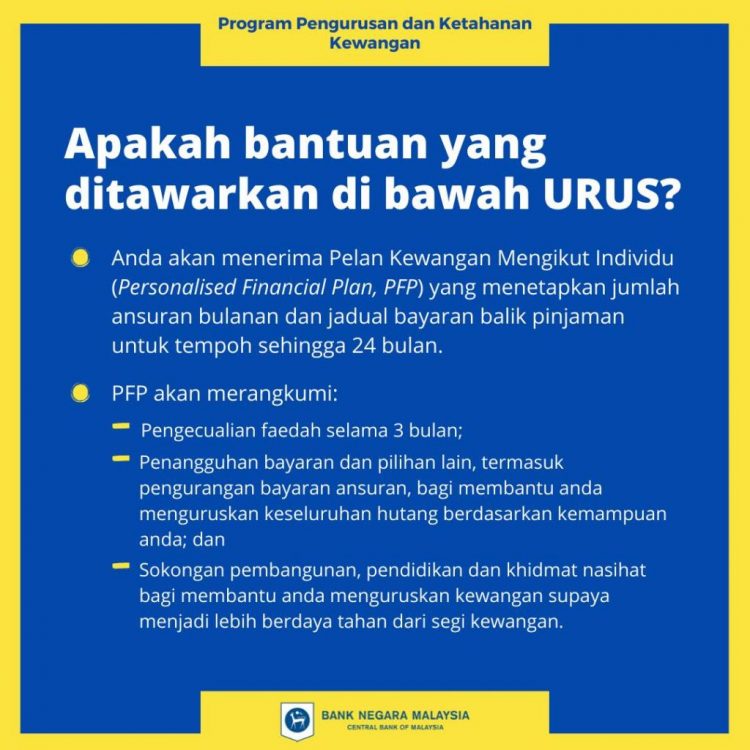 Program URUS ini telah dirangka oleh sektor perbankan bersama-sama dengan Bank Negara Malaysia (BNM) dan Agensi Kaunseling dan Pengurusan Kredit (AKPK). Butiran selanjutnya mengenai program URUS akan diperincikan oleh Kementerian Kewangan.