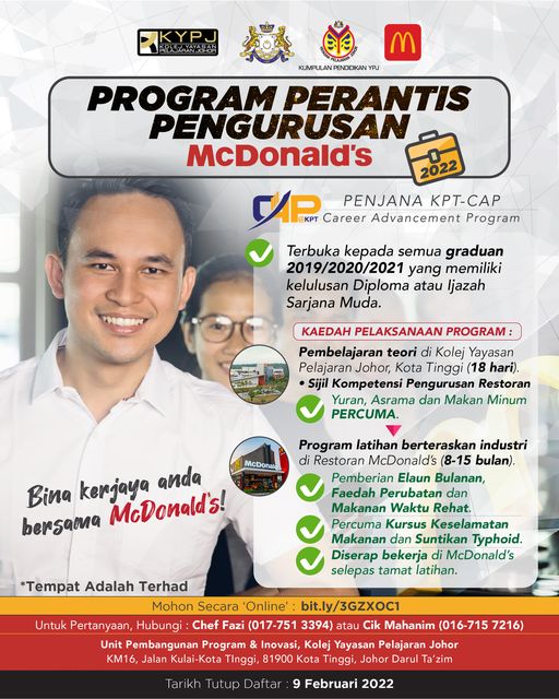 Jom bina kerjaya gemilang dengan menyertai Program Perantis Pengurusan McDonald’s secara PERCUMA! Program di bawah PENJANA KPT-CAP ini merupakan kerjasama di antara McDonald’s Malaysia dan Kolej Yayasan Pelajaran Johor (KYPJ) bagi memberi peluang kepada para graduan tanpa mengira bidang.
