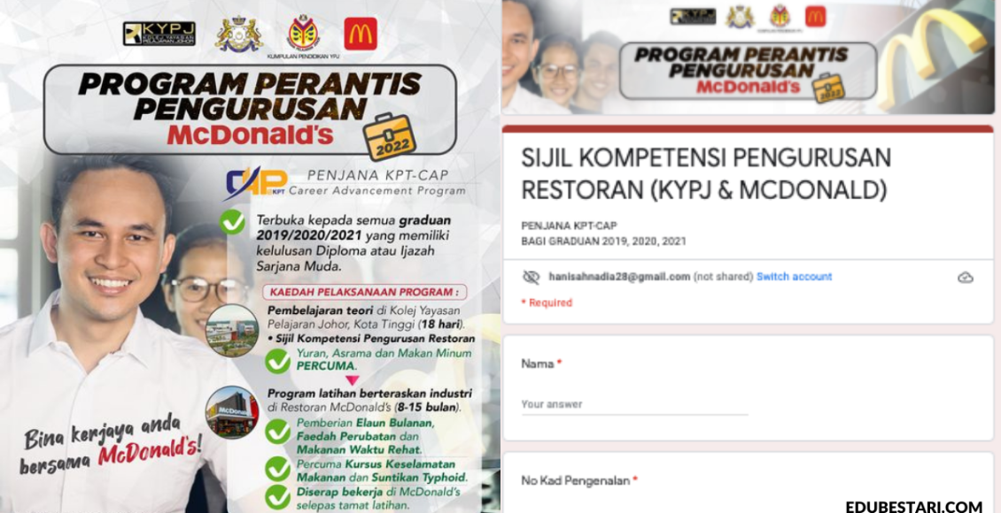 Jom bina kerjaya gemilang dengan menyertai Program Perantis Pengurusan McDonald’s secara PERCUMA! Program di bawah PENJANA KPT-CAP ini merupakan kerjasama di antara McDonald’s Malaysia dan Kolej Yayasan Pelajaran Johor (KYPJ) bagi memberi peluang kepada para graduan tanpa mengira bidang.