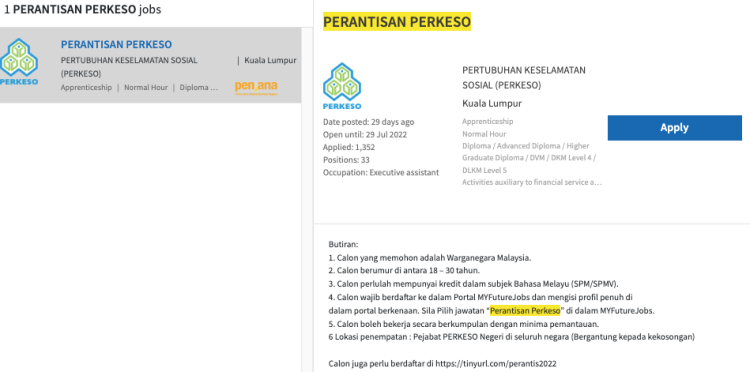 Permohonan Program Perantisan PERKESO 2022 boleh dibuat di pautan berikut: