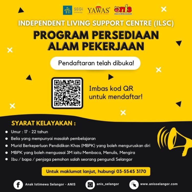 Berita baik buat belia OKU (Masalah Pembelajaran) yang ingin menyambung pelajaran atau bekerja! Jabatan Anak Istimewa Selangor (ANIS) akan mengadakan Program Persediaan Alam Pekerjaan dengan kerjasama Universiti SEGi.