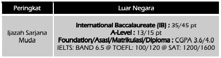 - Syarat kelayakan akademik mengikut peringkat adalah seperti berikut: