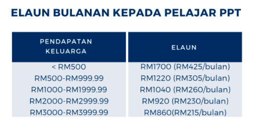 - Elaun Sara Hidup Sepanjang Tempoh Pengajian Bermula Daripada RM 860 Sehingga RM 1700 (1 Semester)