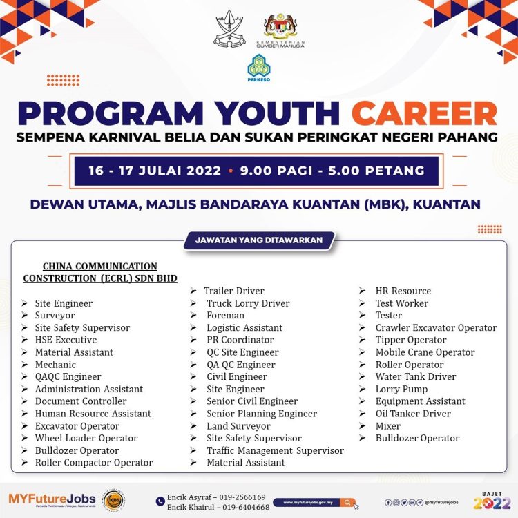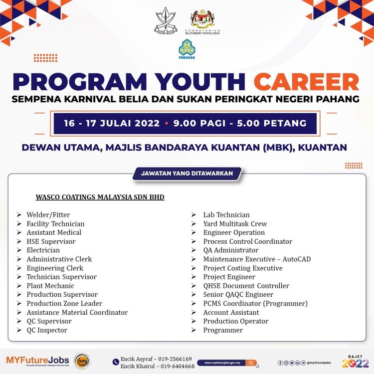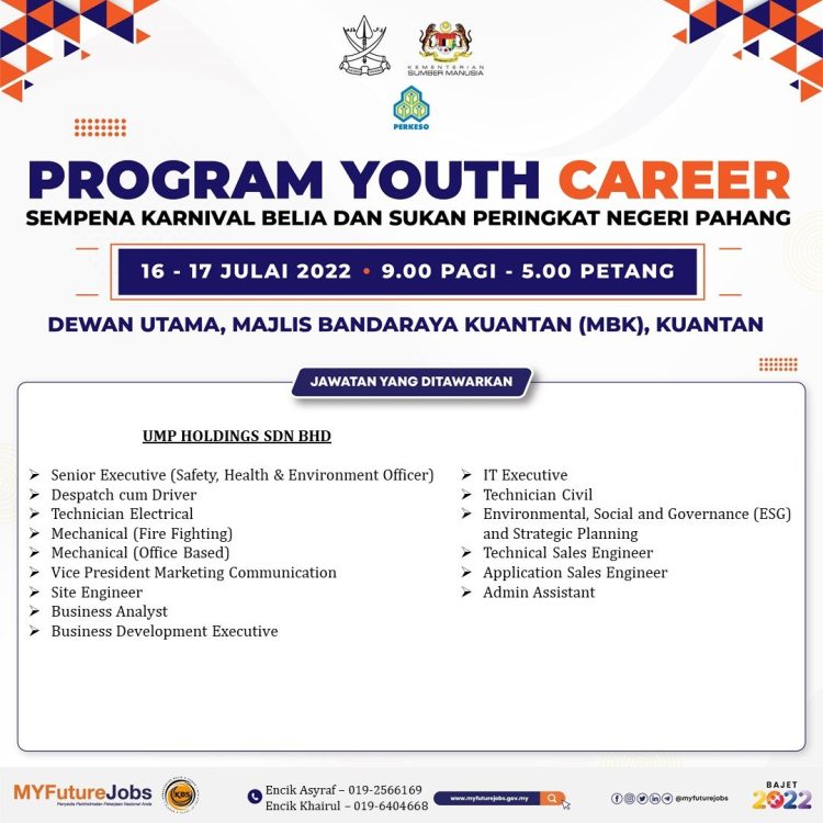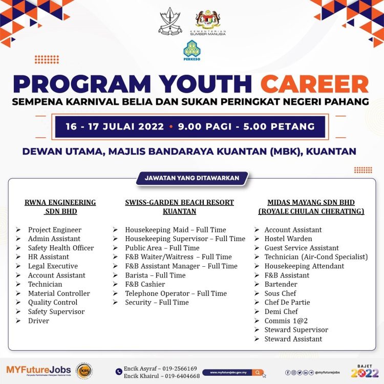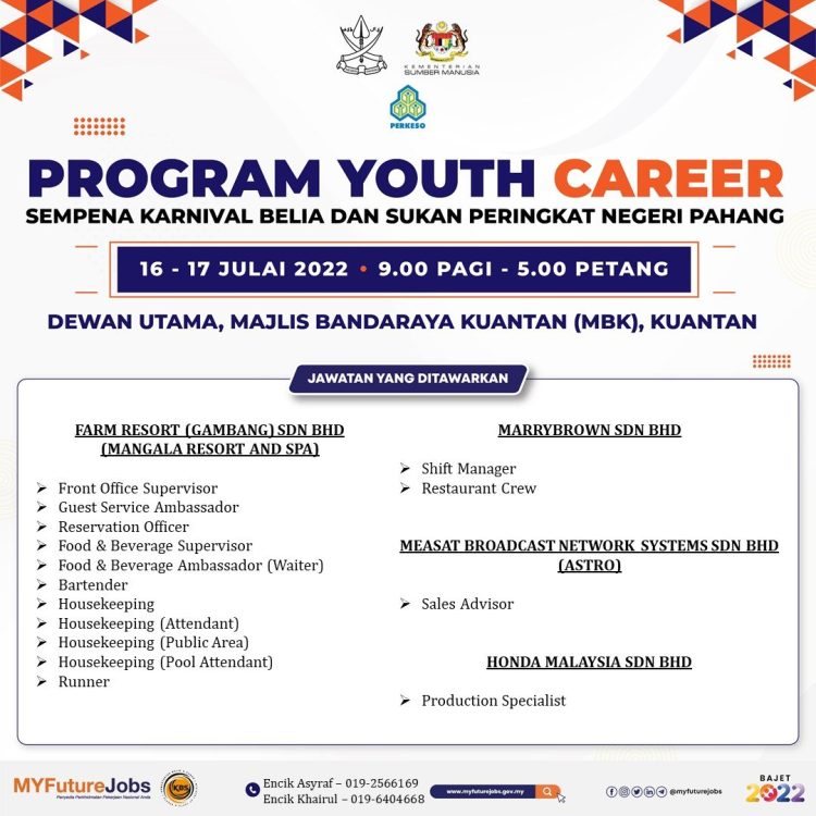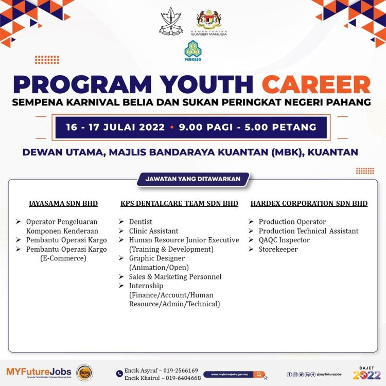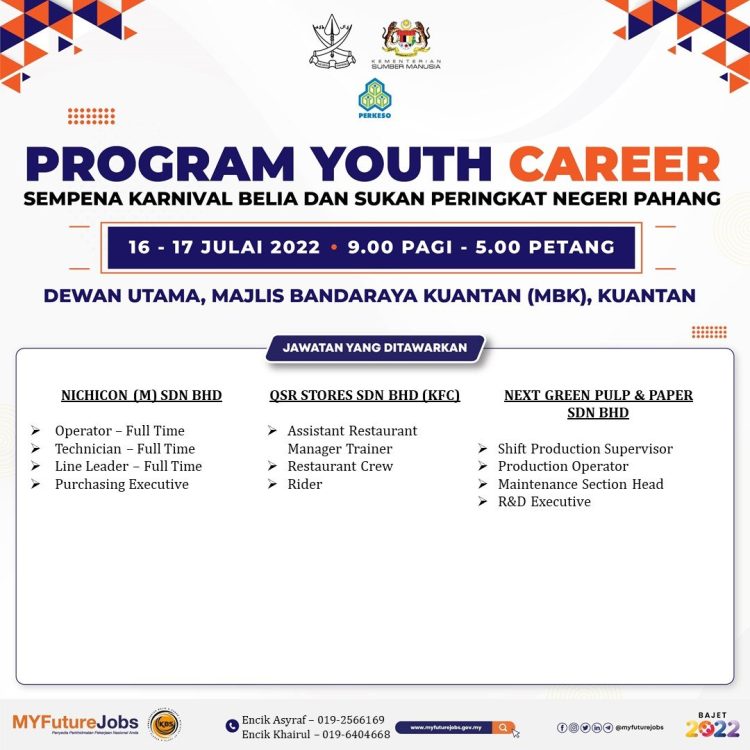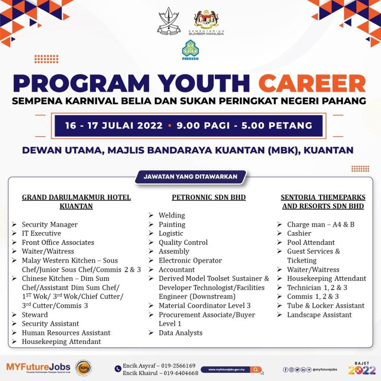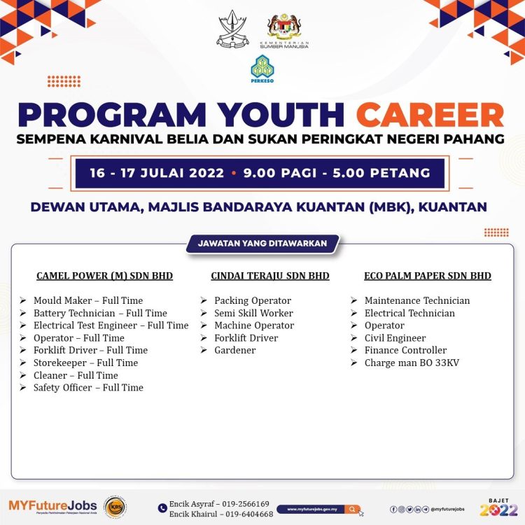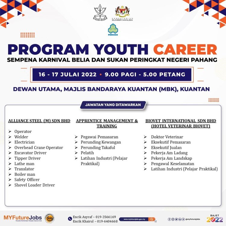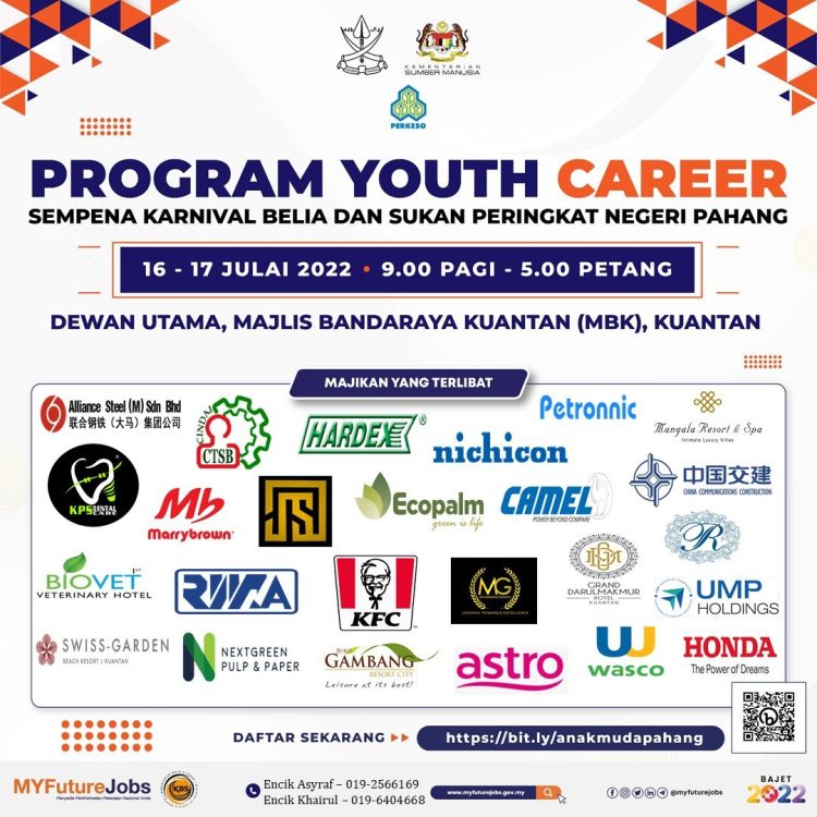 Berita baik buat pencari kerja di luar sana terutamanya graduan dan pekerja yang diberhentikan kerja! PERKESO Pahang akan mengadakan Temu Duga Terbuka Program Youth Career Sempena Karnival Belia dan Sukan Peringkat Negeri Pahang Anjuran PERKESO Pahang secara bersemuka pada 16 & 17 Julai 2022.
