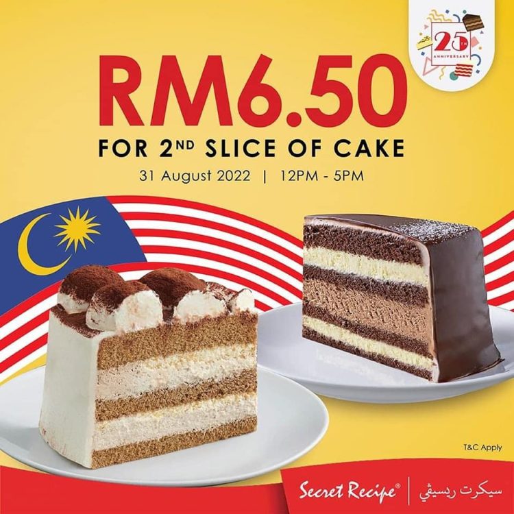 Secret Recipe menawarkan promo kek dengan harga RM6.50 sahaja pagi potongan kedua kek. Tawaran adalah sah pada jam 12 tengahari hingga 5 petang pada 31 Ogos 2022.