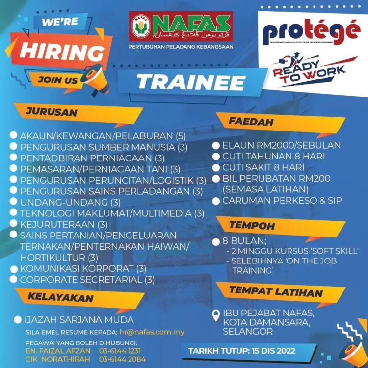 Pertubuhan Peladang Kebangsaan (NAFAS) kini membuka pengambilan calon Protege terbuka buat graduan lepasan universiti dari pelbagai bidang pengajian. Calon yang layak mendapat penempatan akan mengikuti program selama 8 bulan meliputi kursus Soft Skills dan “On The Job Training”.